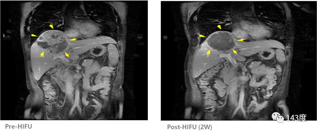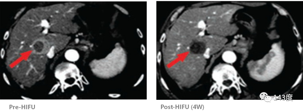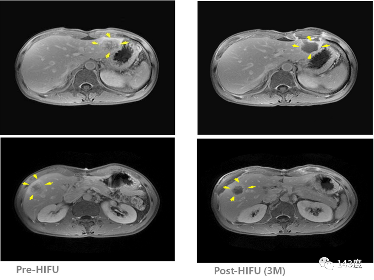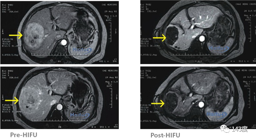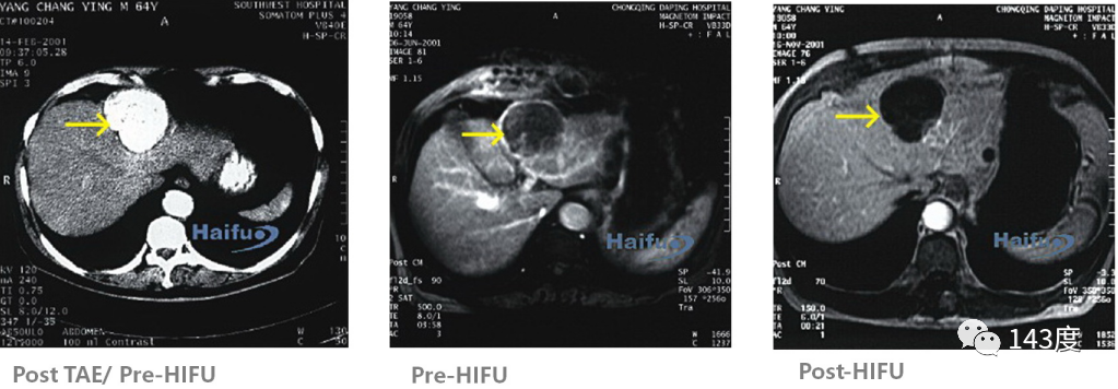 Clinical observation of pre- and post-treatment results, including alpha-fetoprotein levels, liver function, and MRI scans, have shown a clinical remission rate of over 80% for liver cancer patients treated with HIFU. In cases where blood supply to liver tumors is rich, HIFU treatment can be combined with transarterial intervention. Prior to HIFU treatment, transcatheter arterial chemoembolization (TACE) can be performed to block the blood supply to the central tumor area, with the embolic agent serving as a tumor marker to aid in HIFU targeting. Iodine oil alters the acoustic impedance and absorption coefficient within the tumor, facilitating energy conversion at the HIFU focus and improving.