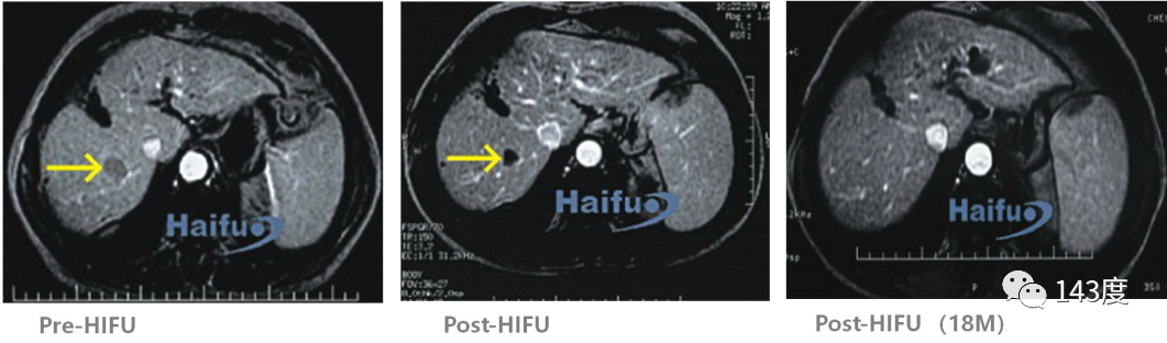 Recurrence observed after surgery for right lobe liver cancer. Complete tumor ablation achieved with HIFU treatment, confirmed by tumor absorption 18 months later.