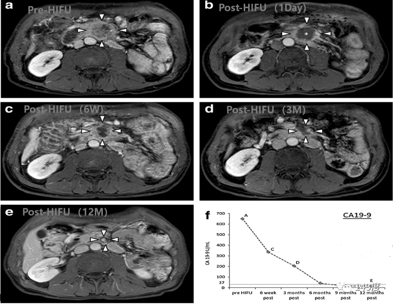 Pain completely relieved within 2 days after HIFU (high-intensity focused ultrasound) treatment. The tumor shrank by 62.6% at 6 weeks, 90.1% at 3 months, and CA199 levels returned to normal at 12 months.