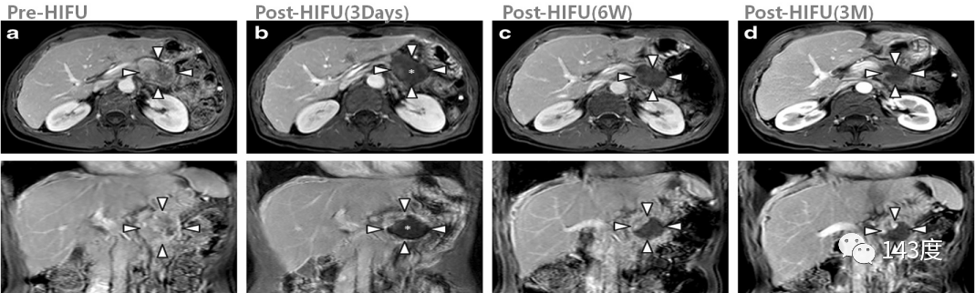 Simultaneous treatment for both pancreatic and liver metastases using ultrasound-guided thermal ablation therapy. A follow-up MRI showed tumor inactivation, with clear and precise margins.