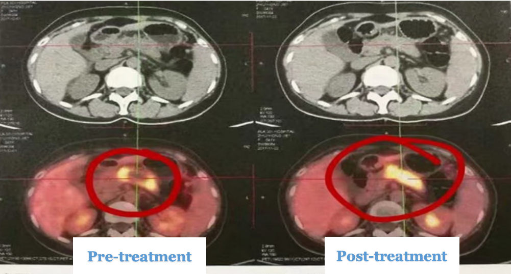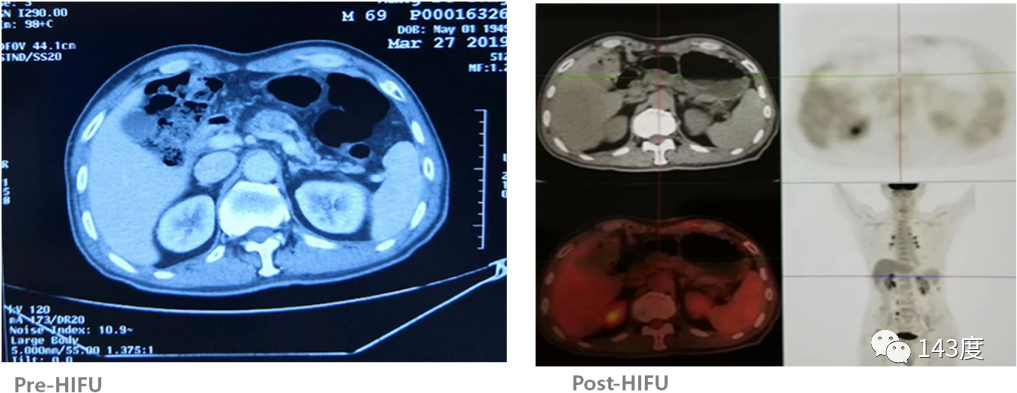 A follow-up PET-CT scan half a month after HIFU treatment revealed complete disappearance of the tumor, no FDG uptake, and a subsequent decline in CA199 levels.