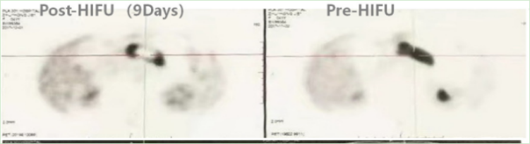After 9 days of HIFU treatment, a follow-up PET-CT scan showed extensive necrosis at the center of the tumor.